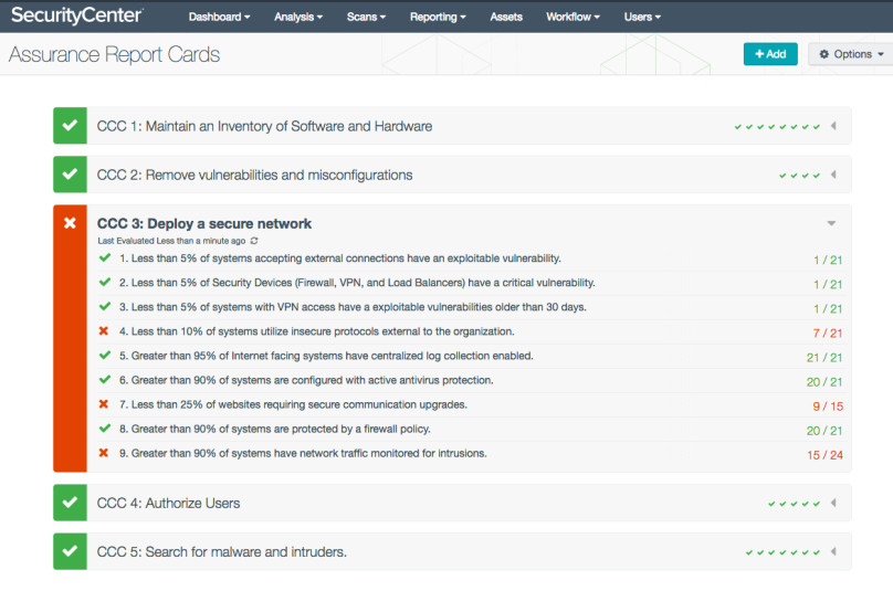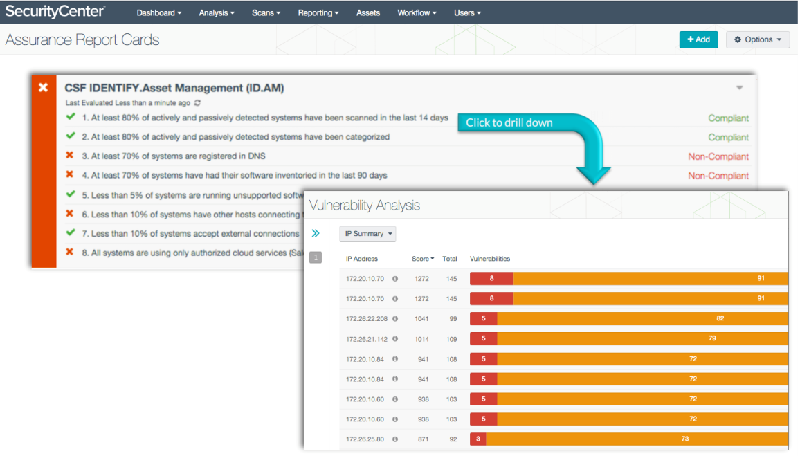 To help CISOs and other IT security leaders more effectively measure their security posture and close the communication gap, Tenable helps you measure security assurance in SecurityCenter Continuous View™ (SecurityCenter CV™). Security assurance capabilities in SecurityCenter CV align security metrics with business goals through proactive measurement, analysis of security metrics, and visualization of security metrics using customizable dashboards, reports, and the industry’s first Assurance Report Cards™ (ARCs).