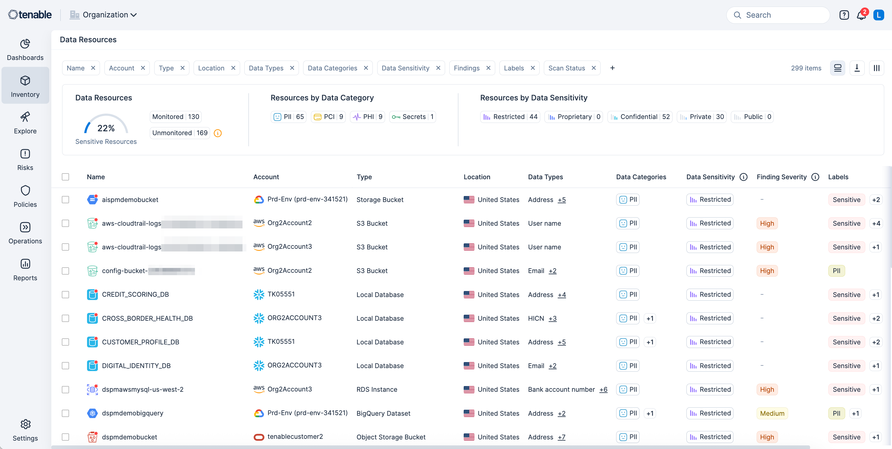 Investigate containers, specific buckets, or databases containing restricted or publicly accessible data. View data labels, severity of findings, and apply filters for accounts, accessibility, or sensitivity.
