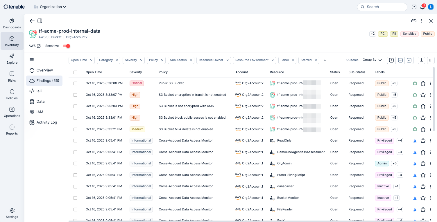 Continuously discover and classify sensitive data across cloud and SaaS environments with Tenable Cloud Security. Define who can access sensitive cloud data and pinpoint where it’s exposed. Correlate data sensitivity with identity and configuration context to prevent leaks, enforce least privilege, and maintain continuous compliance.