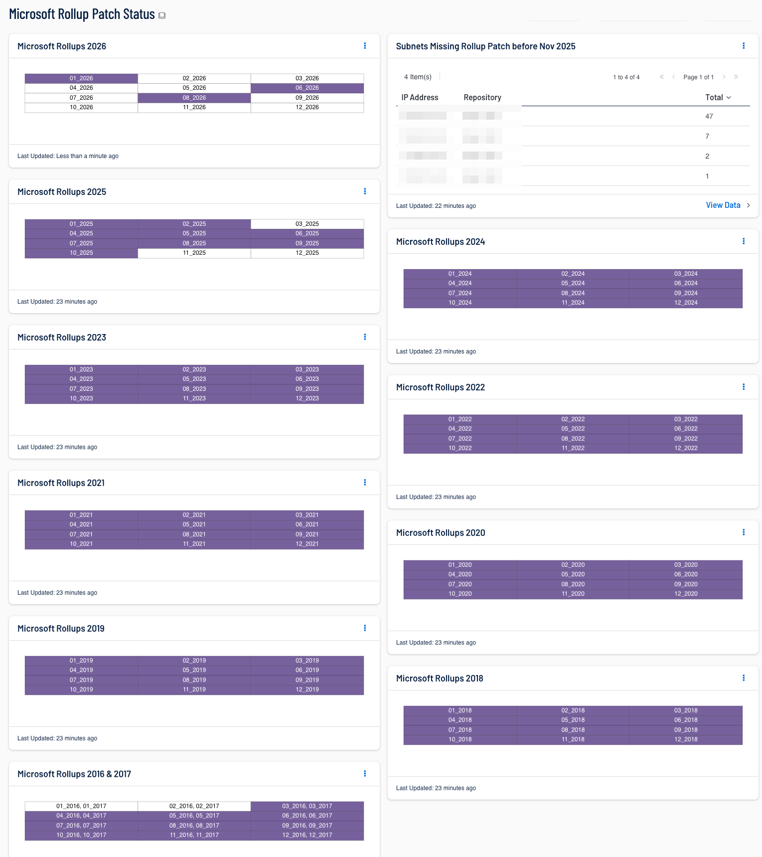 Microsoft Rollups 2016 - 2026: This dashboard as series of matrices that present a yearly analysis by month of fore years 2016 - 2026 Microsoft Rollups applied to hosts. As hosts are discovered having the specific Rollup applied, the box is highlighted in purple. Clicking on a highlighted indicator brings up the analysis screen, allowing further investigation of the hosts.