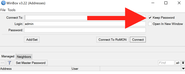 MikroTik's WinBox stores the user's cleartext password in a configuration file when the Keep Password option is selected. Keep Password is enabled by default.