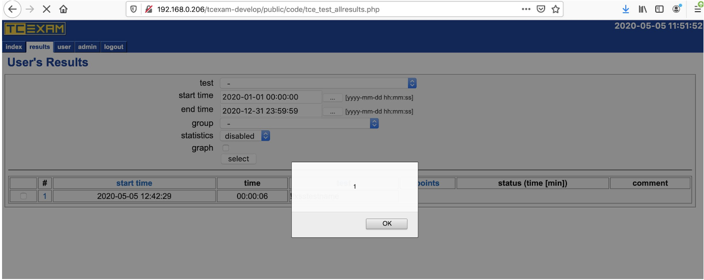 Stored XSS allows an authenticated attacker to inject malicious JavaScript when creating tests. Operators (level 5) or higher can create a new test whose name contains Javascript script tags. In public/code/tce_test_allresults.php there’s a call to F_printTestResultStat() that is called with the unsanitized test name. This will be output without sanitization, causing the Javascript in the test name to execute whenever someone accesses public/code/tce_test_allresults.php and has access to results from a test with a crafted name. So, like previous, the test_name stores the XSS, but it’s executed differently.