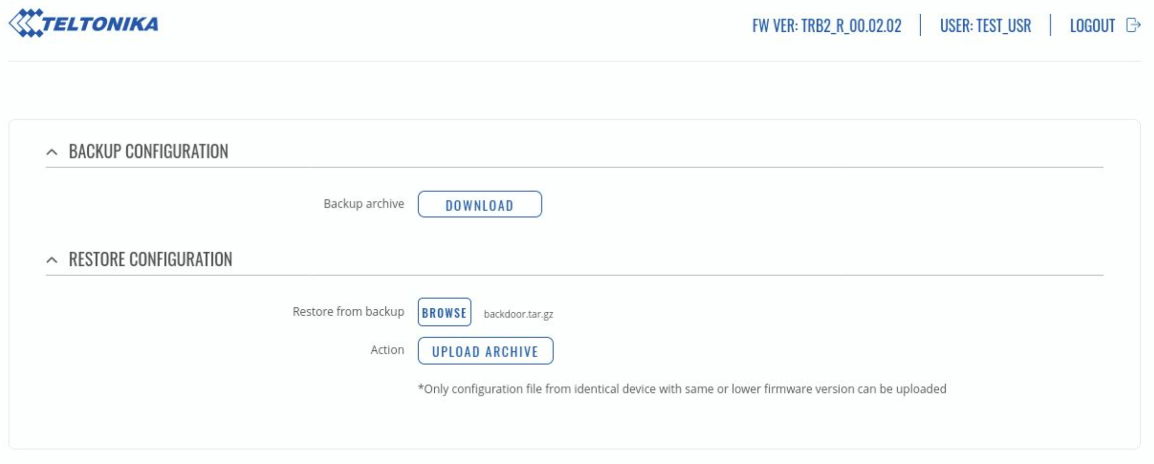 The device has a backup feature that allows a user to download or upload a backup archive. The backup archive contains the /usr/ and /etc/ directories. According to Teltonika’s documentation, a backup archive can only be uploaded if it was generated from an identical device with identical or older firmware.
