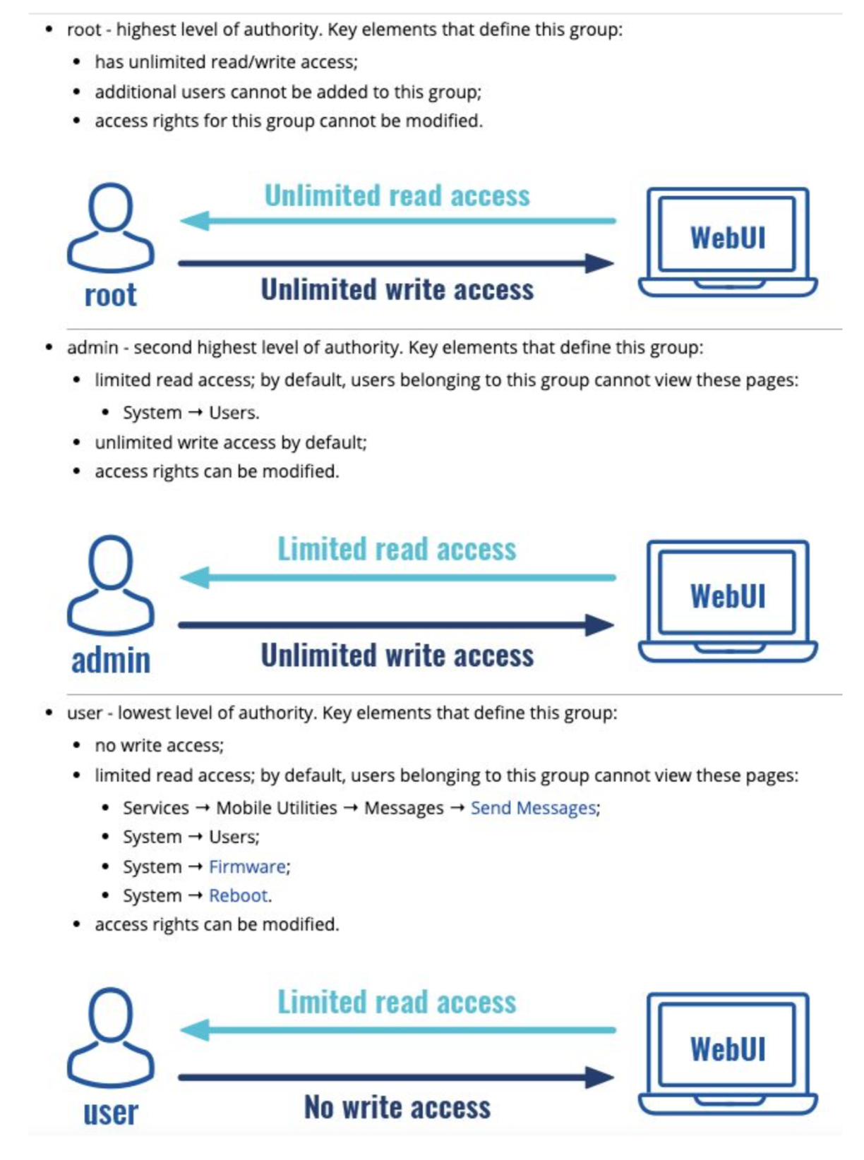There are three levels of privilege possible to configure on the TRB245 web interface.