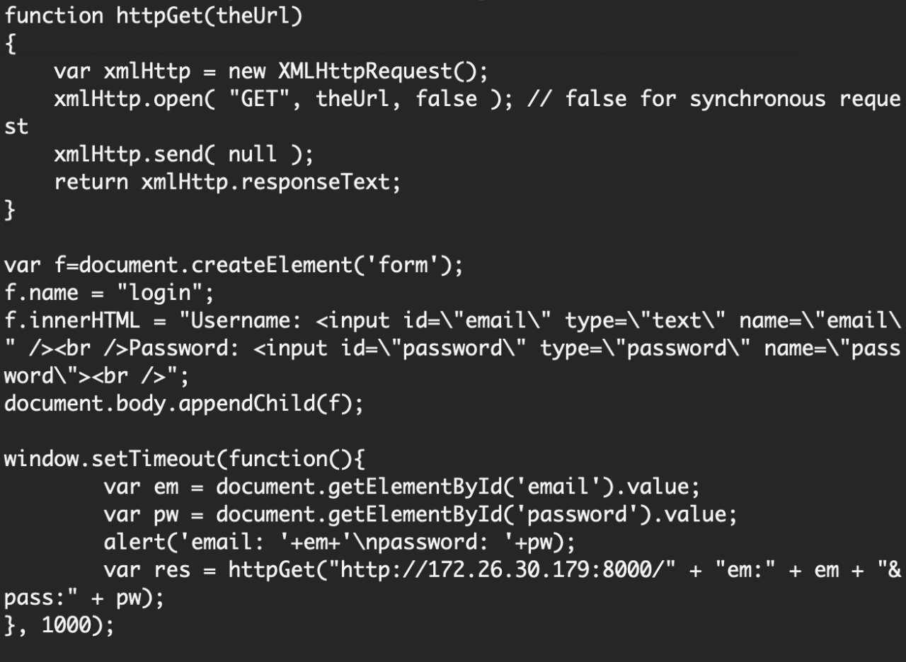 Furthermore, since autocomplete is not disabled for login items, an attacker may be able to retrieve the user’s username and password with the following malicious password.js script (from here):