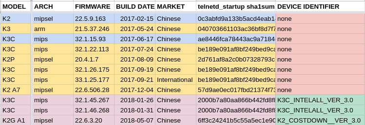 After analysing and testing eleven different firmware versions, for various Phicomm router models, I have identified three distinct variations in the protocol implemented by the telnetd_startup backdoor.