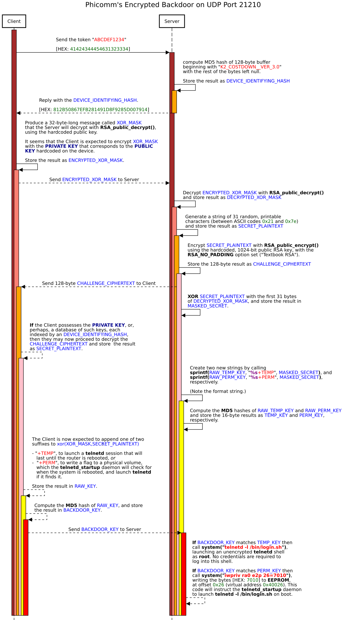 The oldest generation I’ve found of Phicomm’s telnetd_startup protocol (shaded blue, in the tables above) is relatively simple: the server waits to receive an encrypted message, which it decrypts and hashes with two different salts. It then waits for another message, and if that message matches either of those hashes, it will either spawn the telnet service or write a flag to the flash drive to trigger the spawning of telnet on boot. This is the protocol we see in the K2 22.5.9.163, released in early 2017. That particular build made the blunder of hardcoding the private key in the binary, which defeats the purpose of asymmetric encryption. This error enabled the creation of RoutAckProV1B2.exe, a router-hacking tool which has been circulating online for several years, which uses the pilfered private key to allow any interested party to gain root access to this iteration of the backdoor. Of course, as we just saw, use of the private key isn’t even necessary to open the door. What the design overlooks — and this oversight will never be truly corrected — is that it’s not only possible but easy to generate phony ciphertext that a public RSA key will “decrypt” into predictable, phony plaintext. Doing so will permit an attacker to subvert the locking mechanism on the backdoor, and gain unauthorized entry.