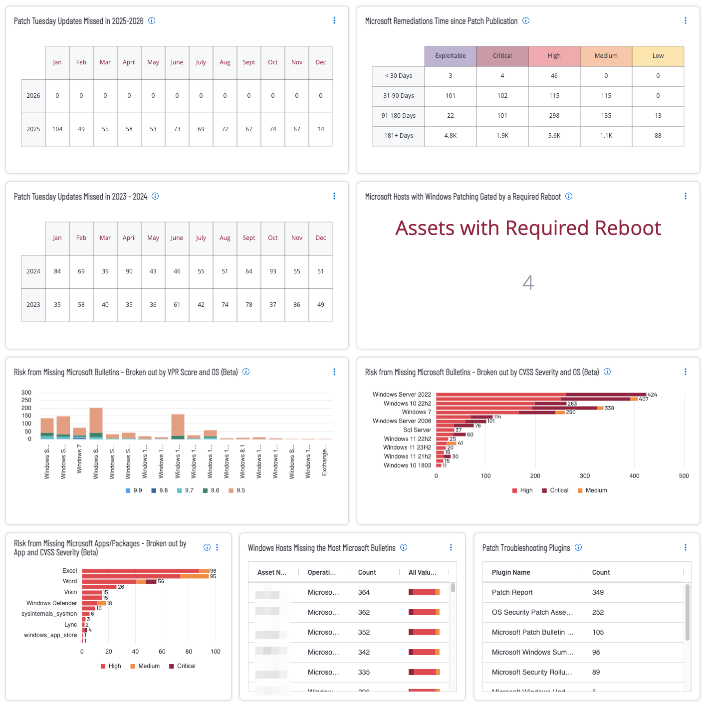 Patch Tuesday Updates Missed in 2025 - 2026 (Explore): This widget displays the missing Microsoft Patch Tuesday updates for each month from the years 2025 - 2026. Each row in the matrix is assigned to the year the patch was released. The other filters used are the MS Bulletin Plugin Family along with finding state, and severity. These numbers illustrate the date the patch was released and not the date the finding was discovered.