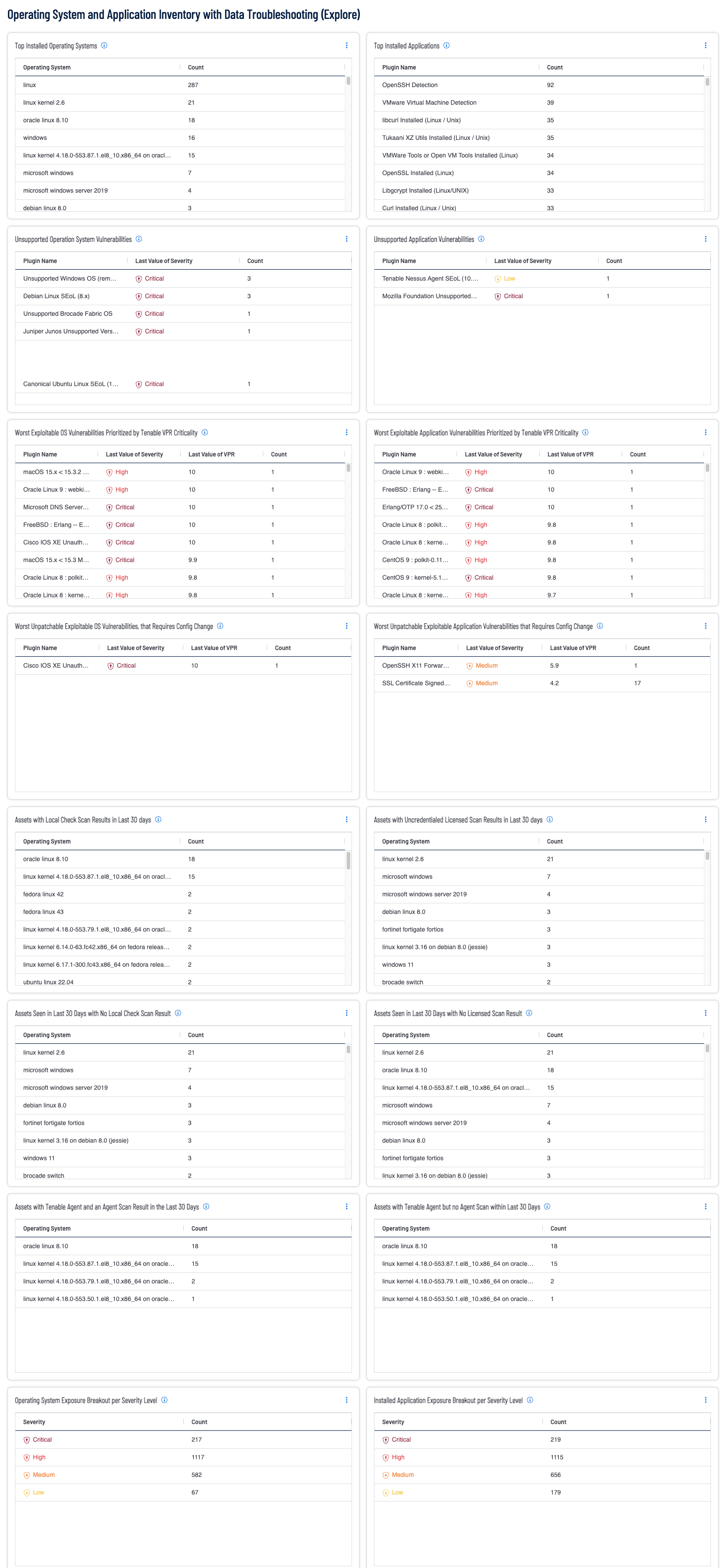 Security practitioners need full visibility of all vulnerabilities within the organization. By leveraging the continuous asset scanning and automated risk prioritization capabilities of Tenable Vulnerability Management (TVM), the practitioner is able to discover operating system and application instances, software vulnerabilities, misconfigurations and other exposure details. This dashboard provides a high-level summary of asset counts per operating system and discovered applications, with the added benefit of helpful queries to identify troublesome areas in scan fidelity.