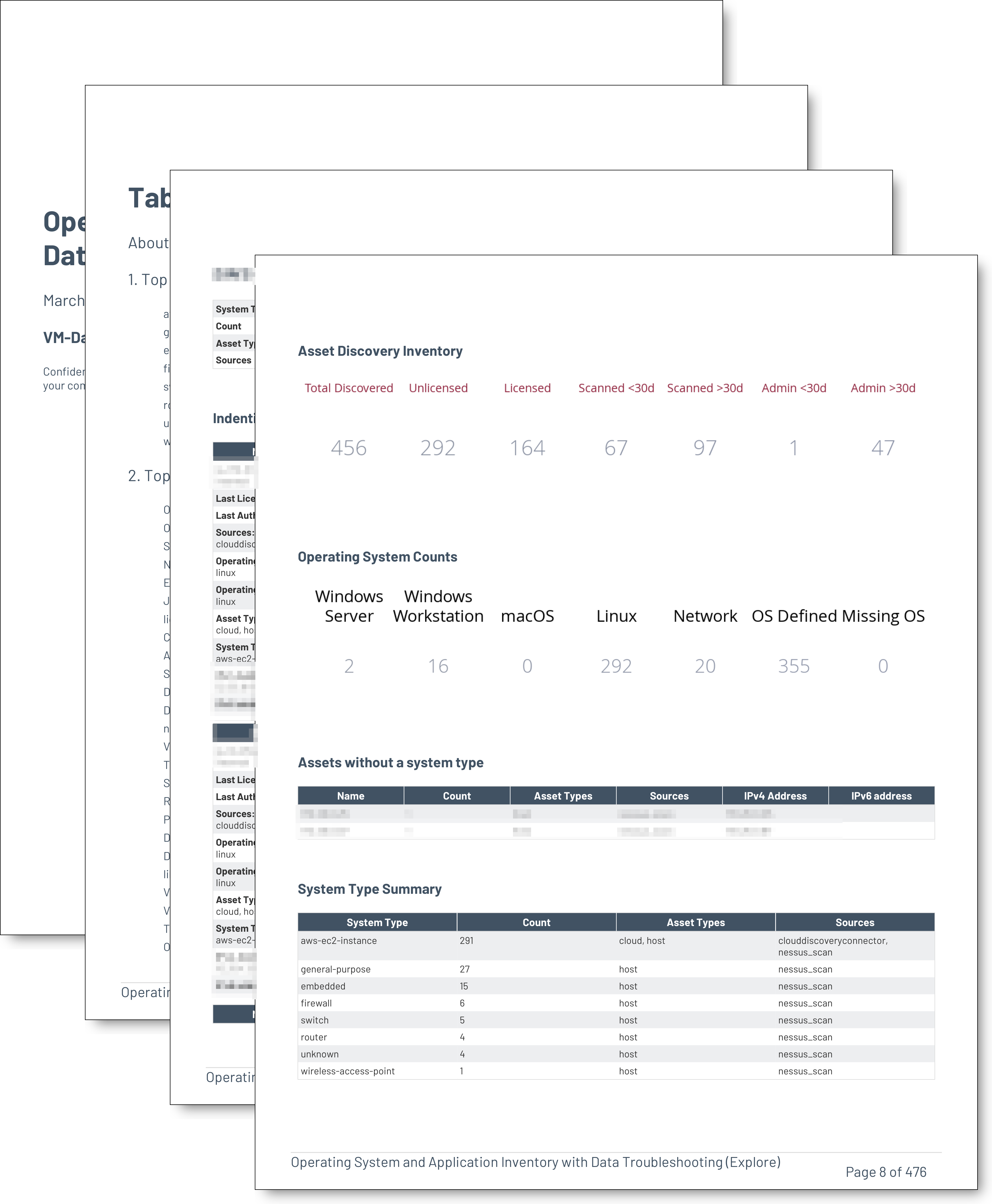 Security practitioners need full visibility of all vulnerabilities within the organization. By leveraging the continuous asset scanning and automated risk prioritization capabilities of Tenable Vulnerability Management (TVM), the practitioner is able to discover operating system and application instances, software vulnerabilities, misconfigurations and other exposure details. This report provides a high-level summary of asset counts per operating system and discovered applications, with the added benefit of helpful queries to identify troublesome areas in scan fidelity.